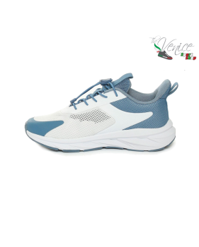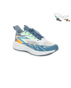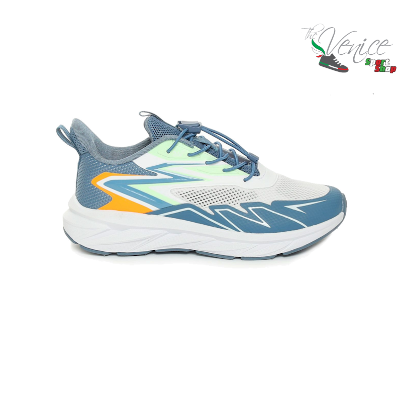 L’intersuola ammortizzata assorbe efficacemente gli impatti, offrendo comfort prolungato, mentre la suola in gomma assicura grip e affidabilità su diverse superfici. Il design moderno, con dettagli nei toni del blu e arancione su base bianca, completa il look con un tocco dinamico e sportivo.